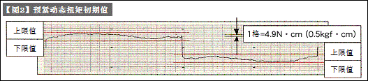 測(cè)量?jī)蓚€(gè)方向上的預(yù)加載扭矩,預(yù)緊動(dòng)態(tài)扭矩的標(biāo)準(zhǔn)值可以保證出貨品質(zhì)。【圖2】是預(yù)緊扭矩= 20.6至37.2 N·cm。