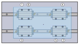 注意:滑軌裝配螺絲的鎖緊順序是,從中央位置開始向端部按照順序鎖緊,這樣也可獲得穩(wěn)定。